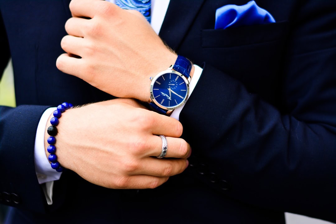 Der Anzug ist in der Farbe Dark Navy mit einem weißen Hemd kombiniert. Dazu dunkelblaue Lackschuhe mit schwarzen Details. Eine Krawatte mit meinem Lieblingsmuster – Paisley, welches farblich zu den Schuhen und dem Outfit passt. Das Einstecktuch hat den gleichen Hellblauton wie beim Paisley Muster. Doch was gehört zu einem guten Business Look noch dazu? Genau – eine sehr gute Auswahl an Schmuck.